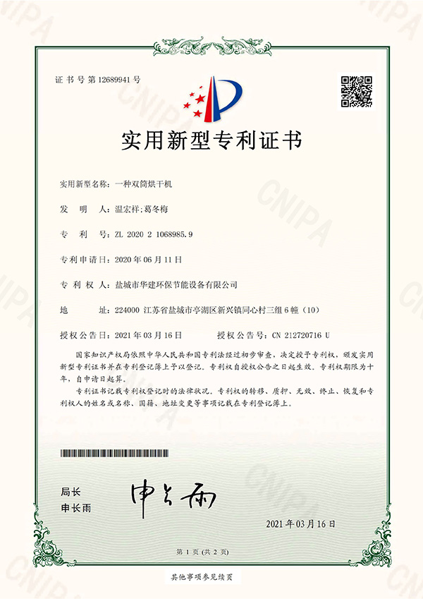 一種單筒回轉(zhuǎn)烘干機-實用新型專利證書