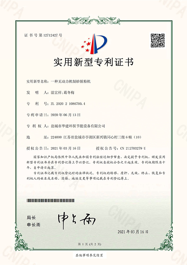 一種復(fù)合機制砂脫粉機-實用新型專利證書